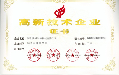 2013年11月27日,湖北省科學技術廳、湖北省財政廳、湖北省國家稅務局、湖北省地方稅務局聯合下發《關于公布湖北省2013年第二批高新技術企業擬認定結果的通知》文件,湖北泱盛生物科技有限公司通過國家高新技術企業認定,2014年2月19日完成備案工作,于近日下發了相關證書,證書編號:GR201342000372,有效期3年。
