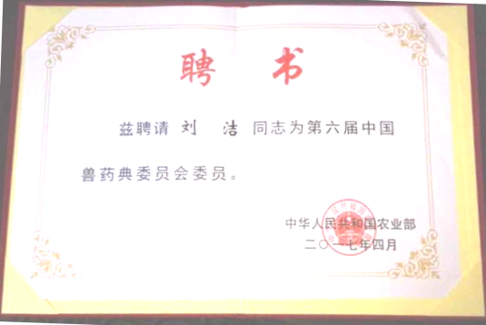 照片:劉潔博士當選第六屆中國獸藥典委員會委員聘書。